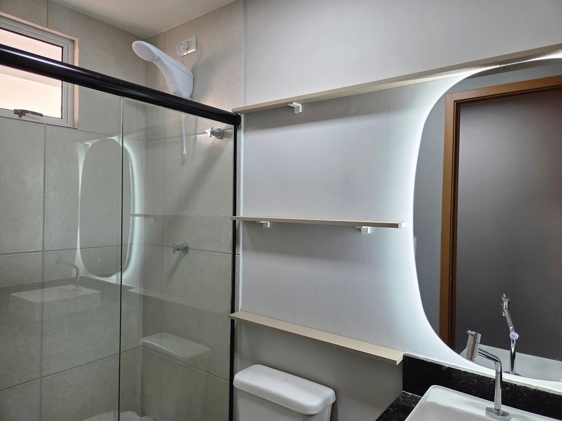 O banheiro é moderno e funcional, com espelho iluminado e acabamento de qualidade, garantindo conforto no dia a dia.