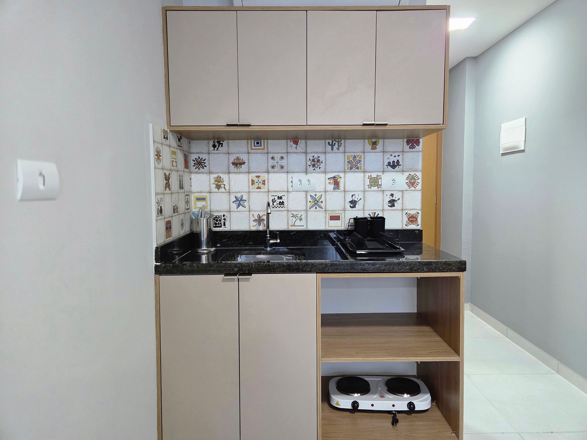 O ambiente integrado conta com cama de casal aconchegante, sofá para relaxar e uma mesa de jantar prática, ideal para refeições rápidas ou até para quem precisa trabalhar durante a viagem. A cozinha compacta está equipada com pia, cooktop, frigobar e utensílios básicos, e ainda traz um toque regional no revestimento colorido que dá charme ao espaço.