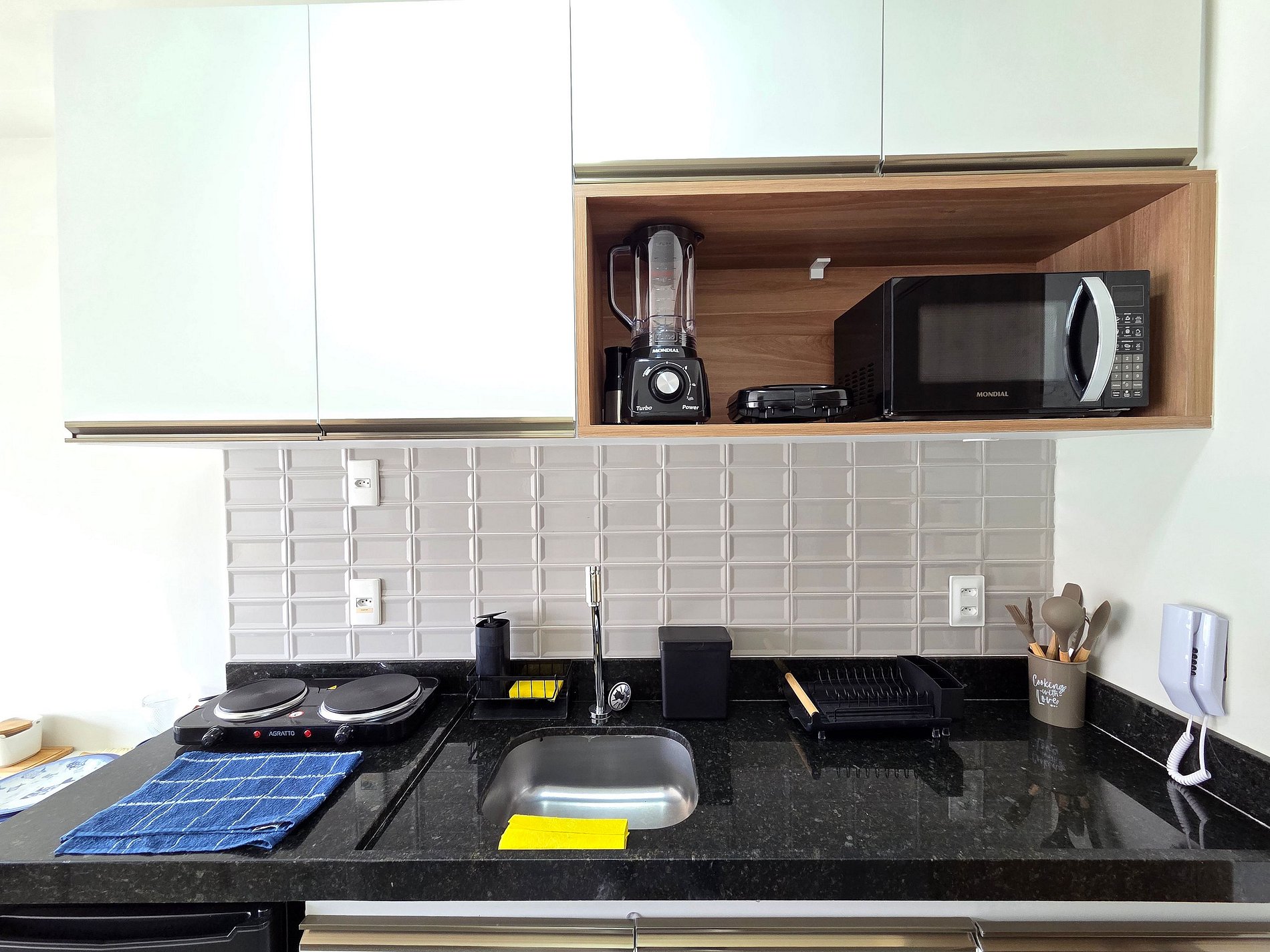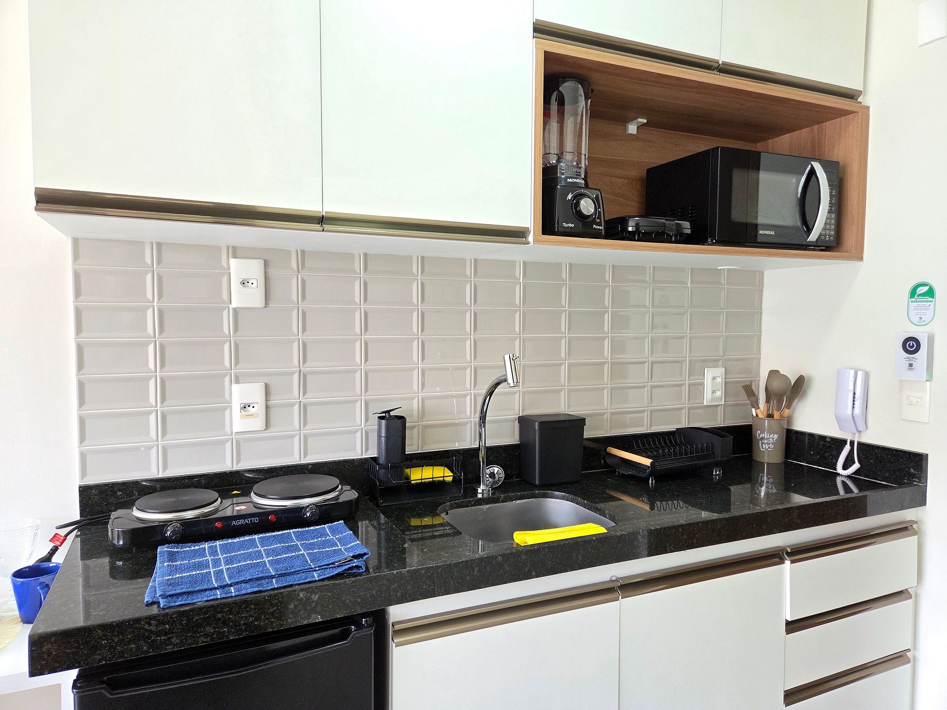 O ambiente é integrado e climatizado, com uma cama de casal, camaa solteiro, cozinha compacta completa, smart TV e Wi-Fi de alta velocidade