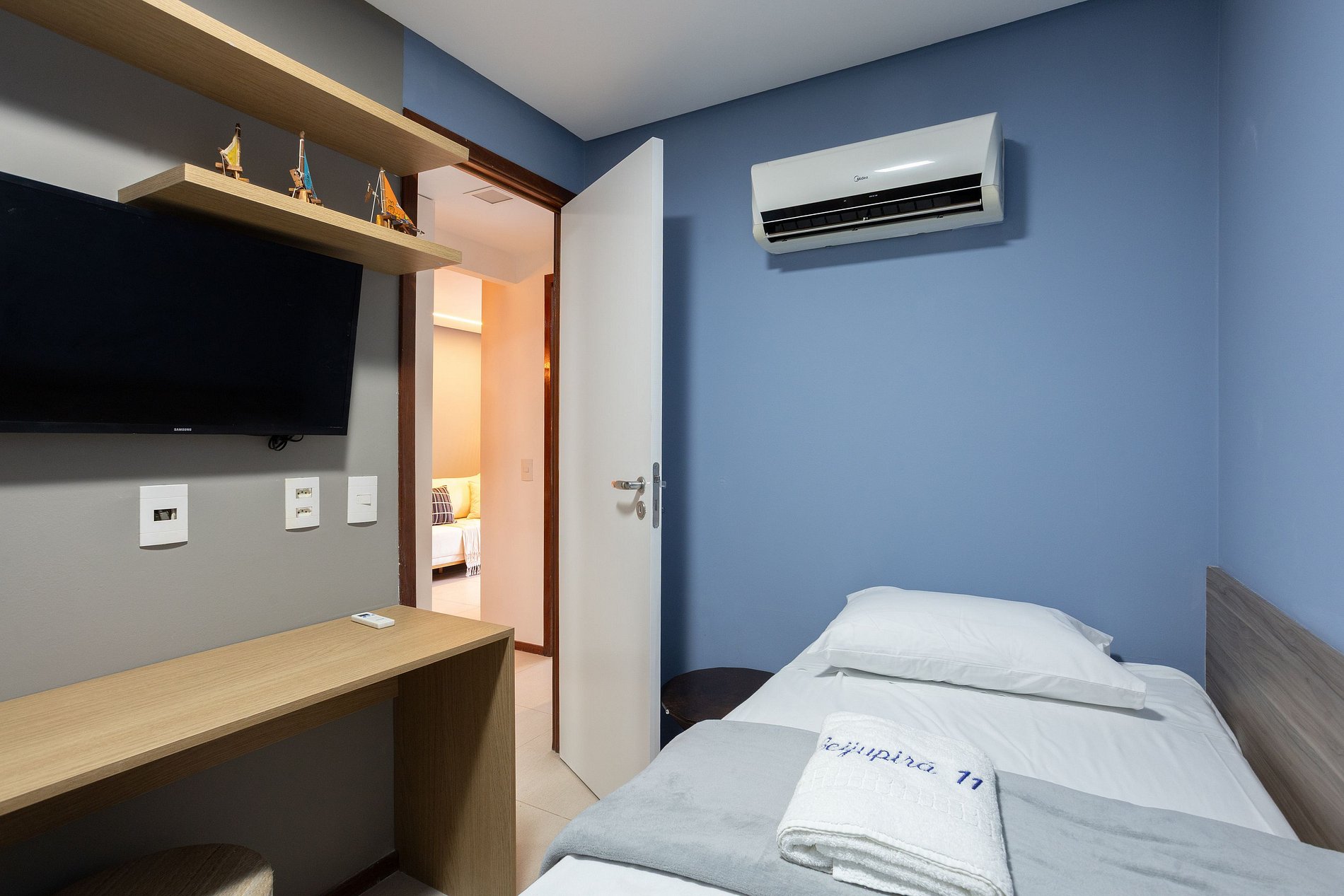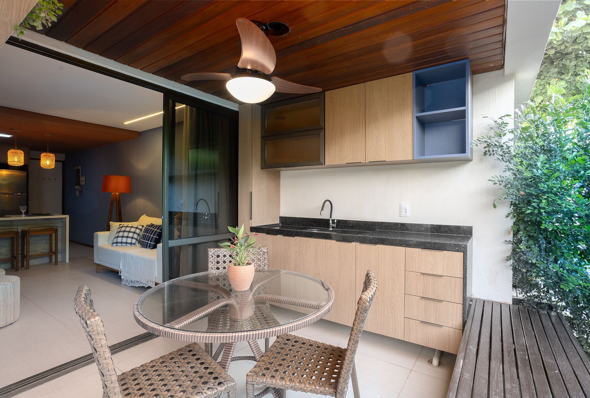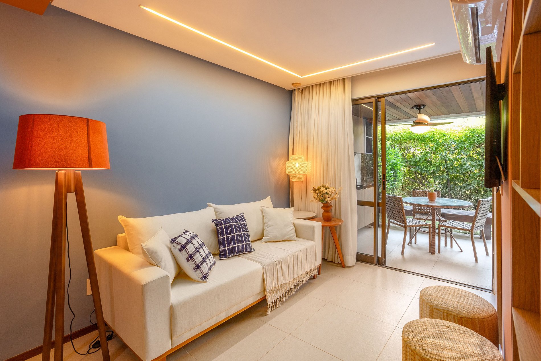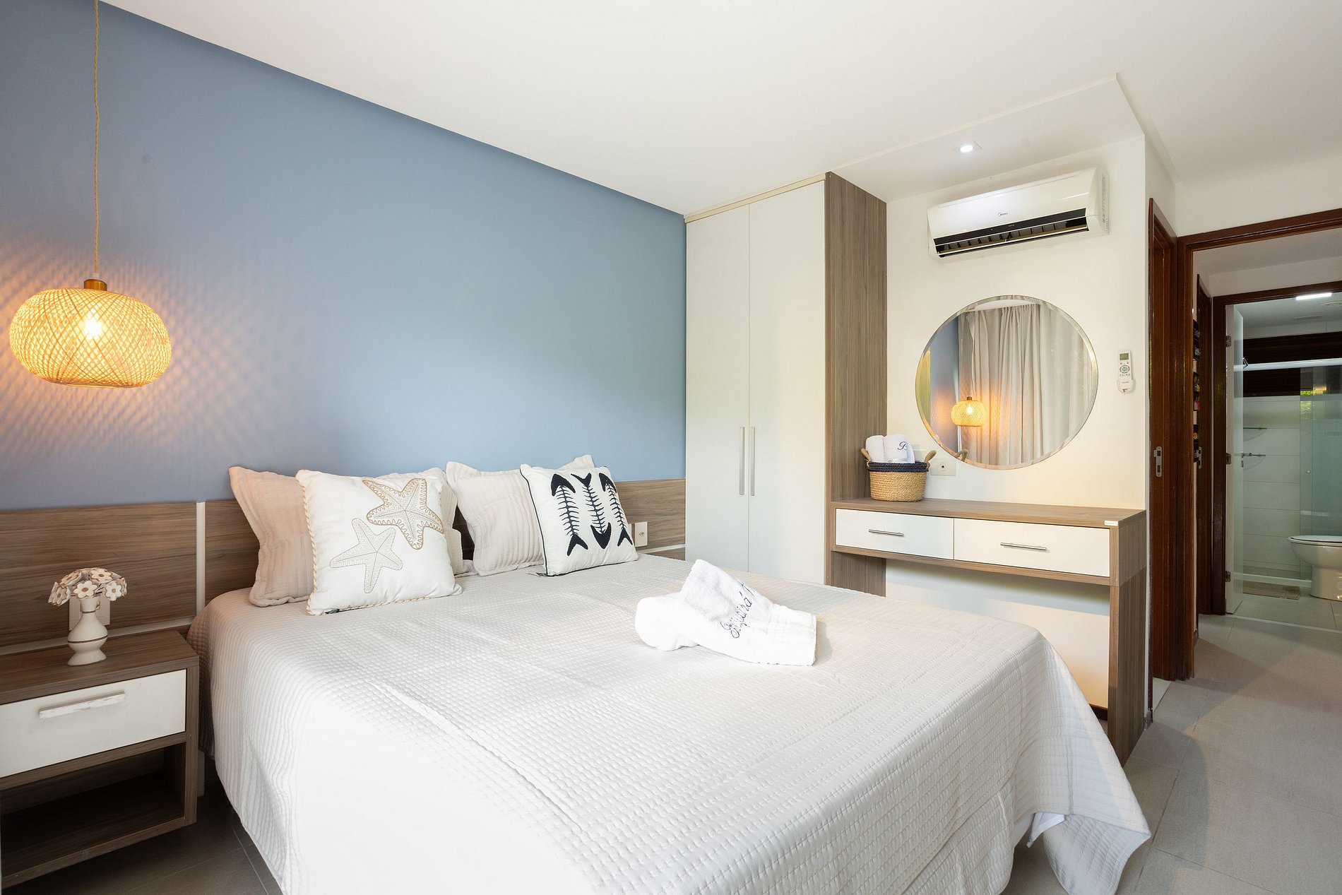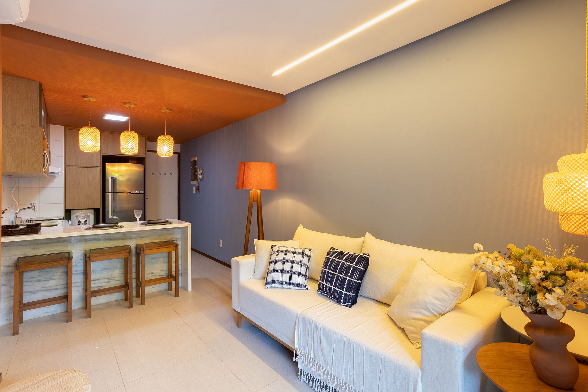 Com 2 quartos completos, ambos com ar-condicionado, armários e enxoval de qualidade; Sala de estar ampla e arejada, com sofá confortável, TV e acesso direto à varanda; Varanda mobiliada, ideal para relaxar no fim da tarde;