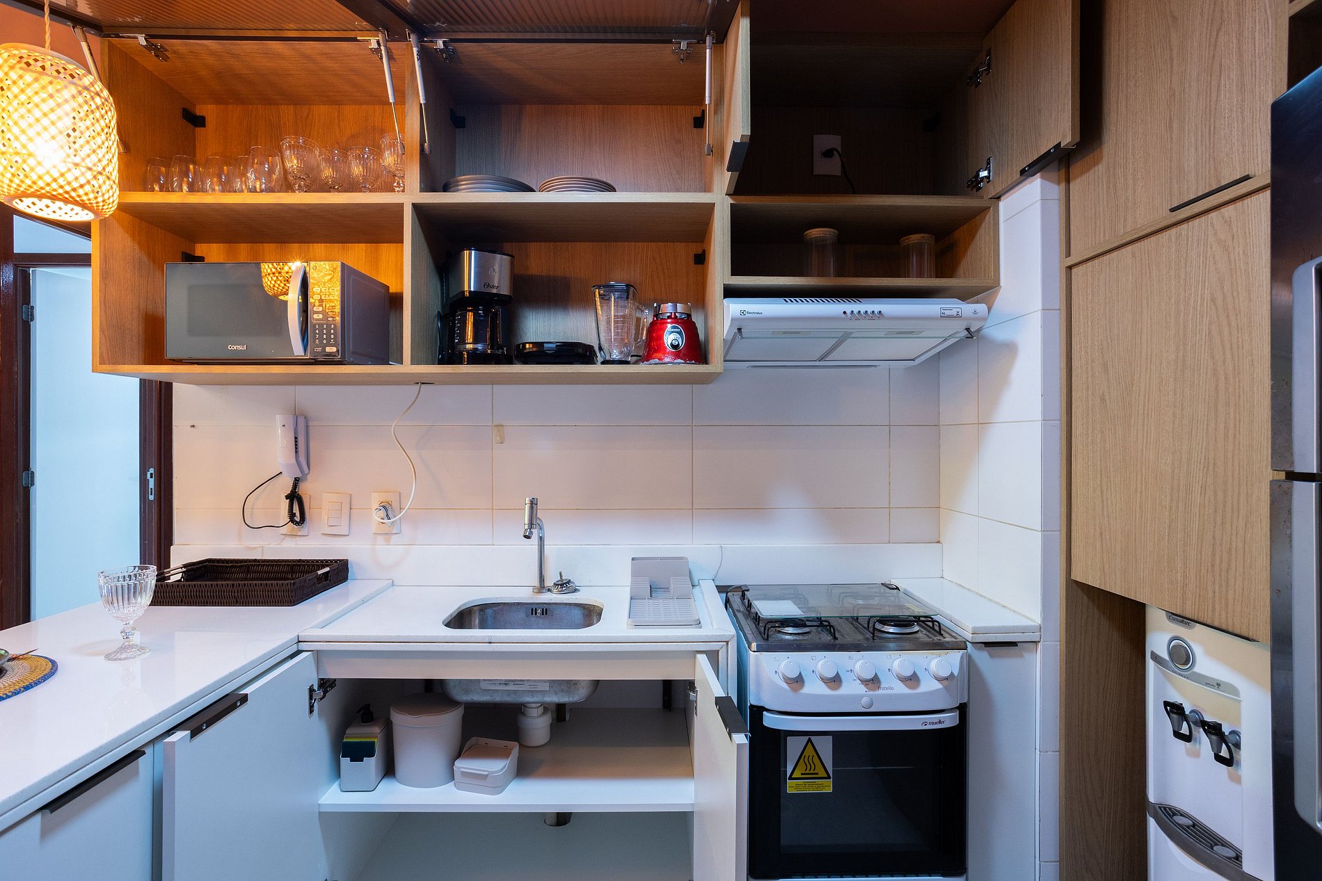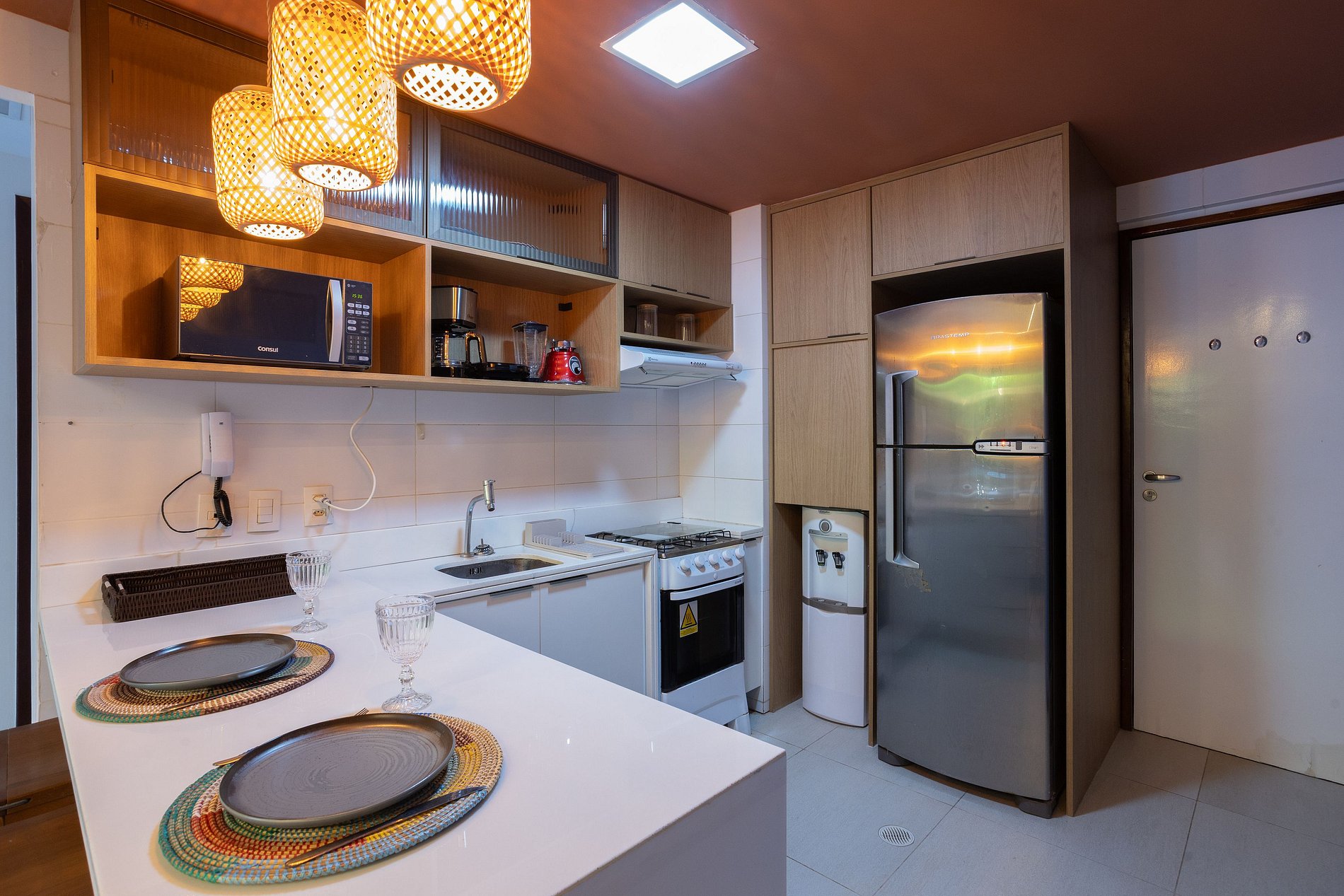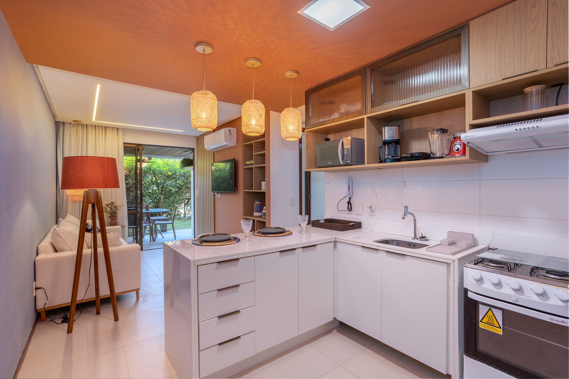 Cozinha equipada com geladeira duplex, micro-ondas, cooktop, utensílios e eletros modernos; Wi-Fi de alta velocidade e smart TV com acesso a plataformas de streaming;