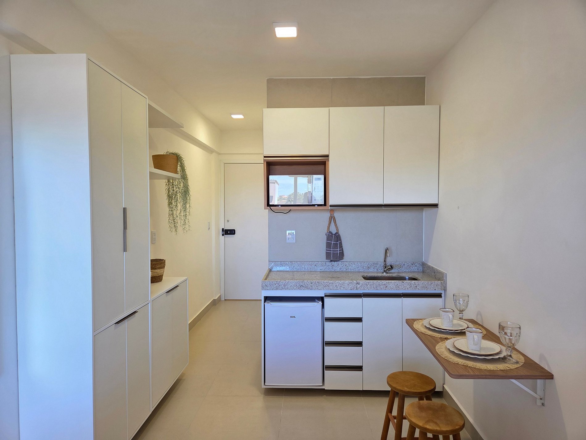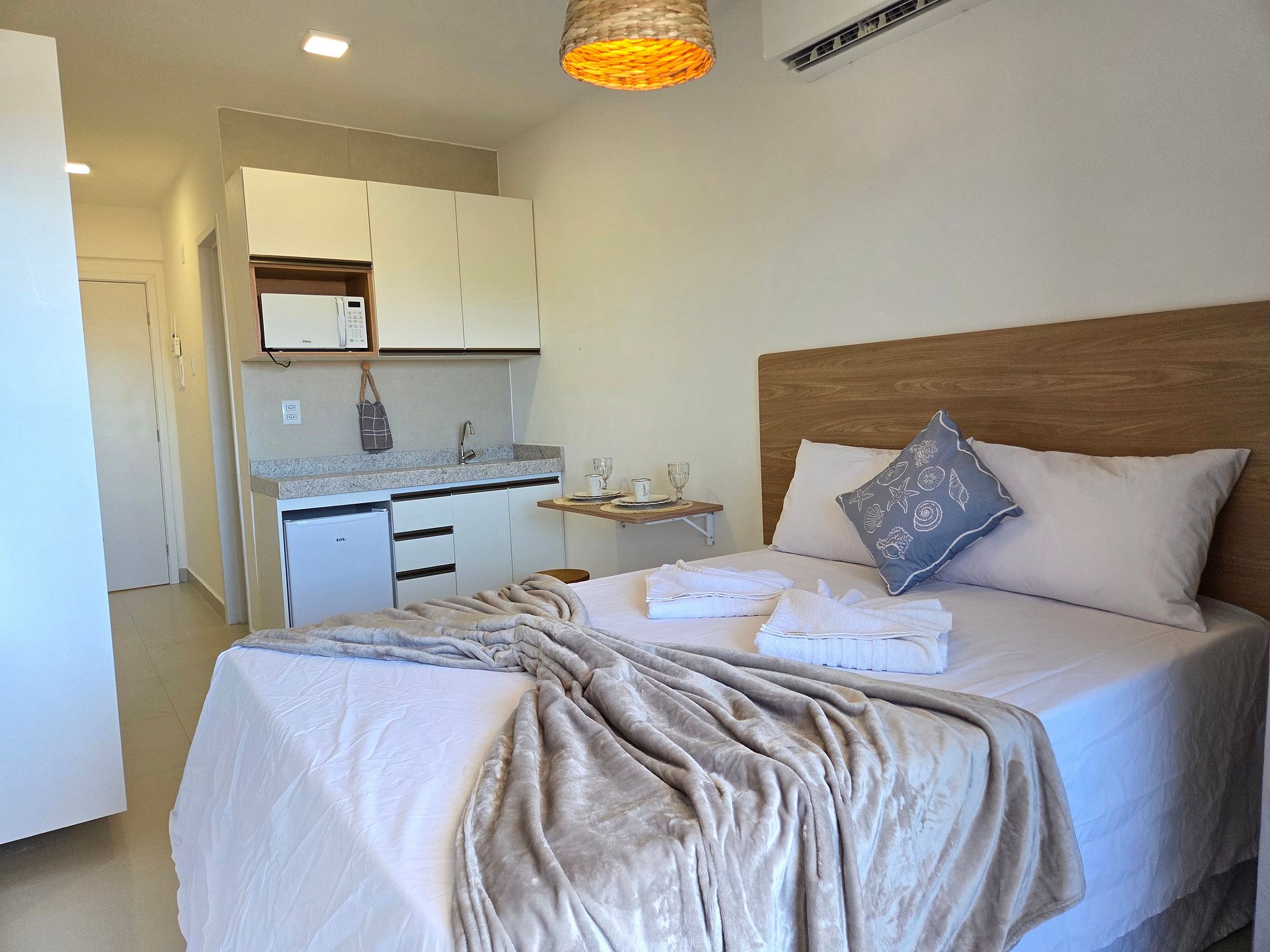 Studio moderno e aconchegante, ideal para até 3 pessoas. O espaço conta com uma confortável cama queen e uma cama de solteiro, perfeito para casais ou pequenas famílias que desejam aproveitar dias tranquilos perto do mar O ambiente é bem equipado, oferecendo itens básicos de cozinha para pequenas refeições, como sanduicheira, liquidificador e utensílios essenciais, além de secador de cabelo. O studio combina um clima acolhedor com tudo o que você precisa