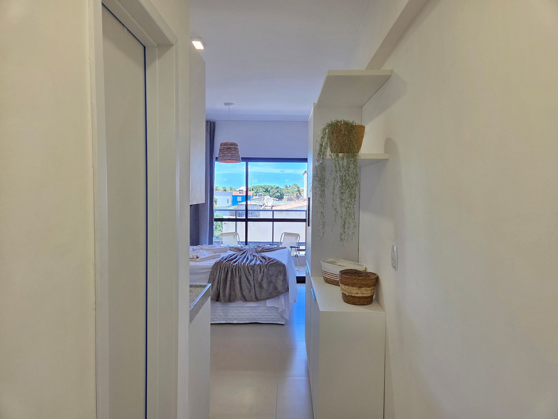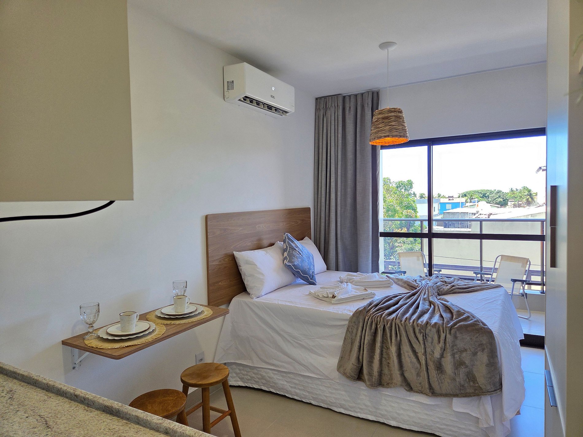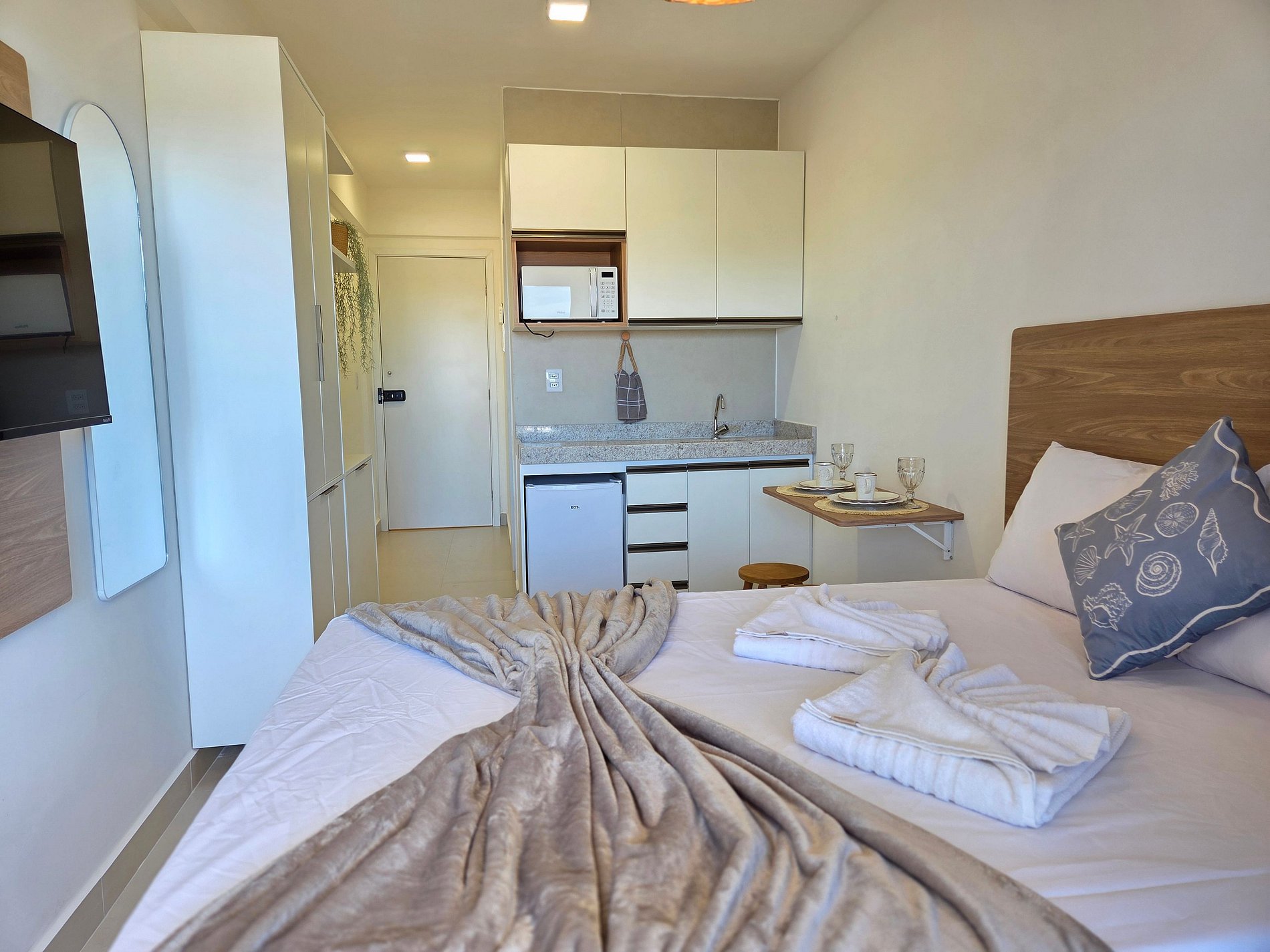 Studio moderno e aconchegante, ideal para até 3 pessoas. O espaço conta com uma confortável cama queen e uma cama de solteiro, perfeito para casais ou pequenas famílias que desejam aproveitar dias tranquilos perto do mar O ambiente é bem equipado, oferecendo itens básicos de cozinha para pequenas refeições, como sanduicheira, liquidificador e utensílios essenciais, além de secador de cabelo. O studio combina um clima acolhedor com tudo o que você precisa