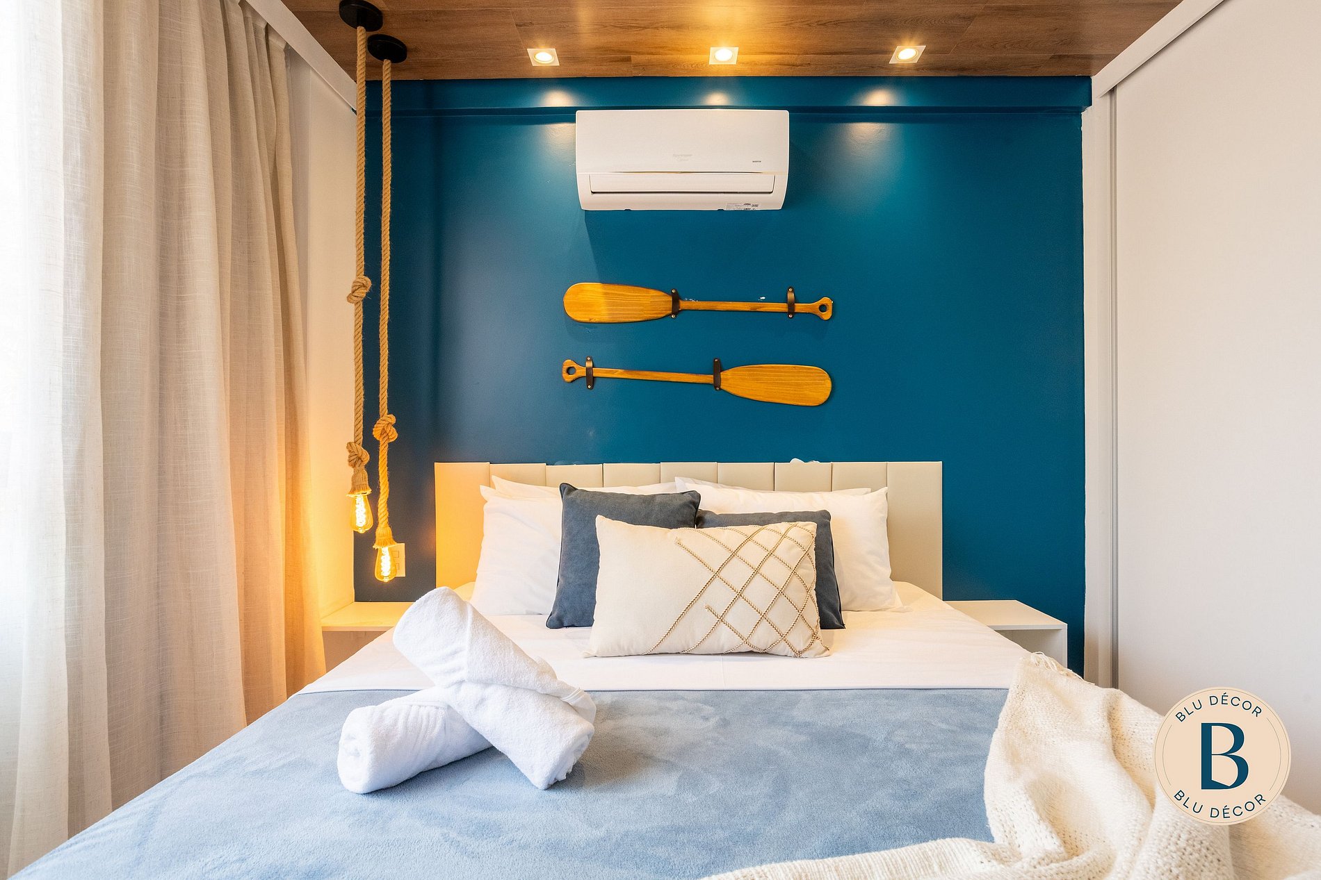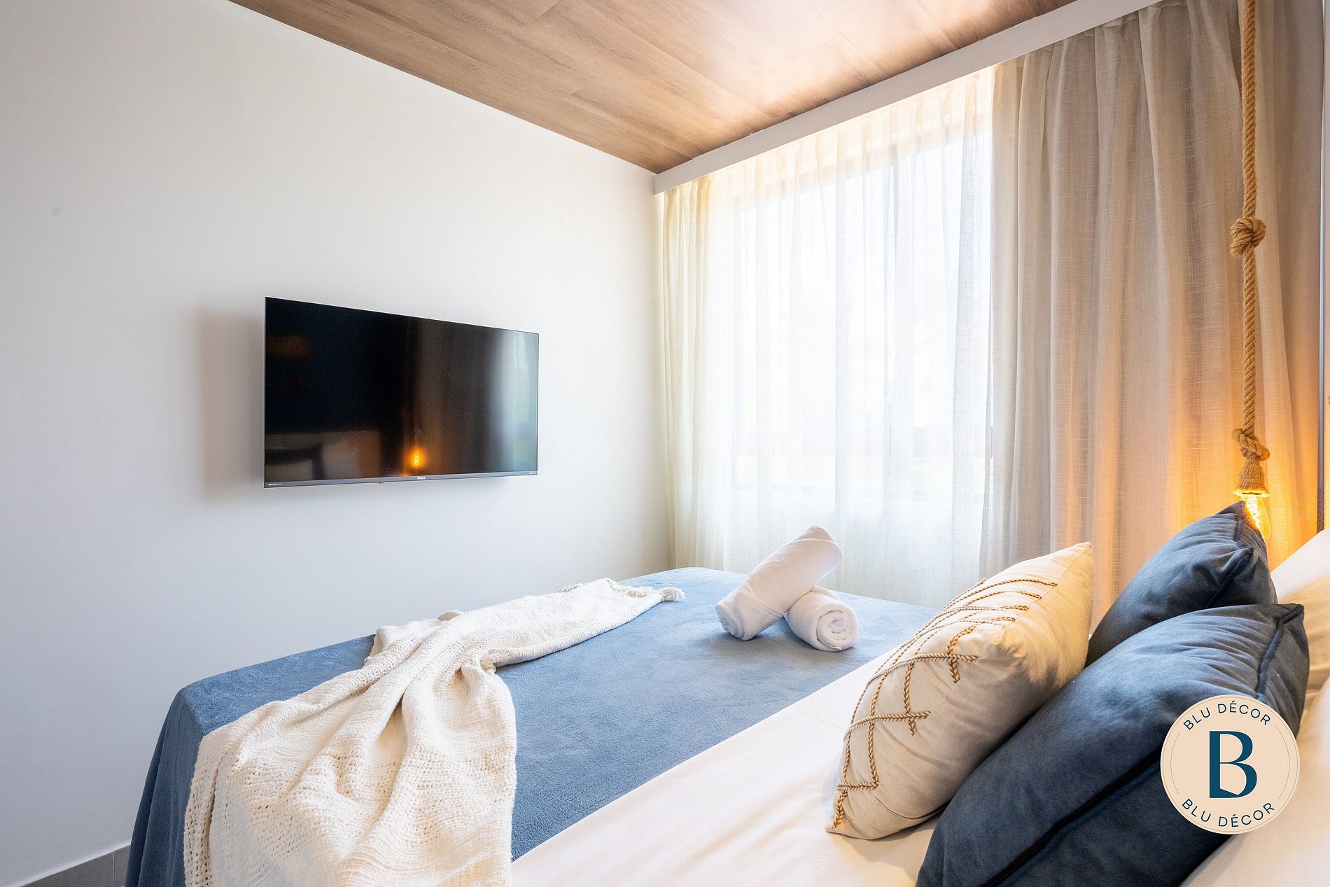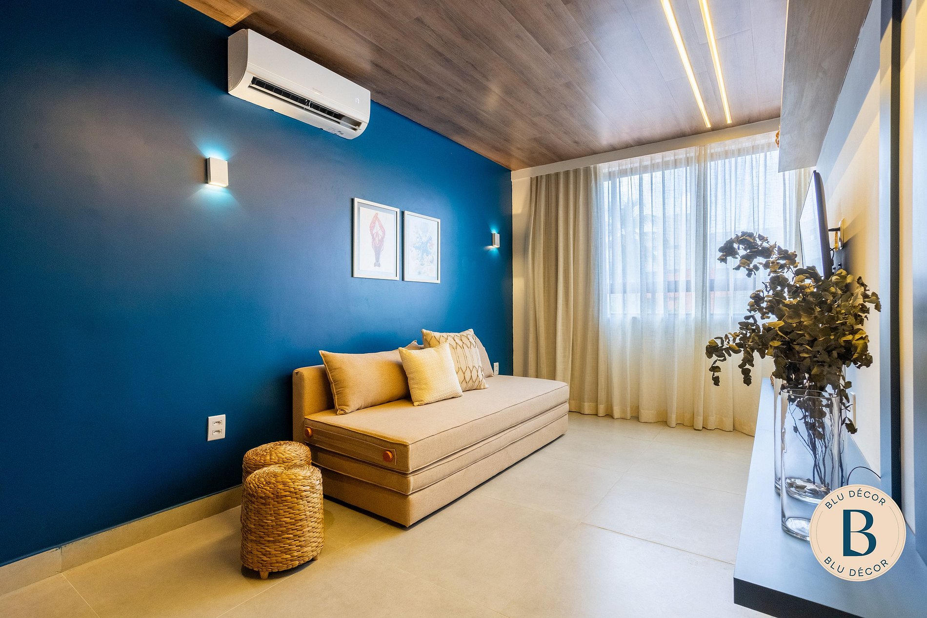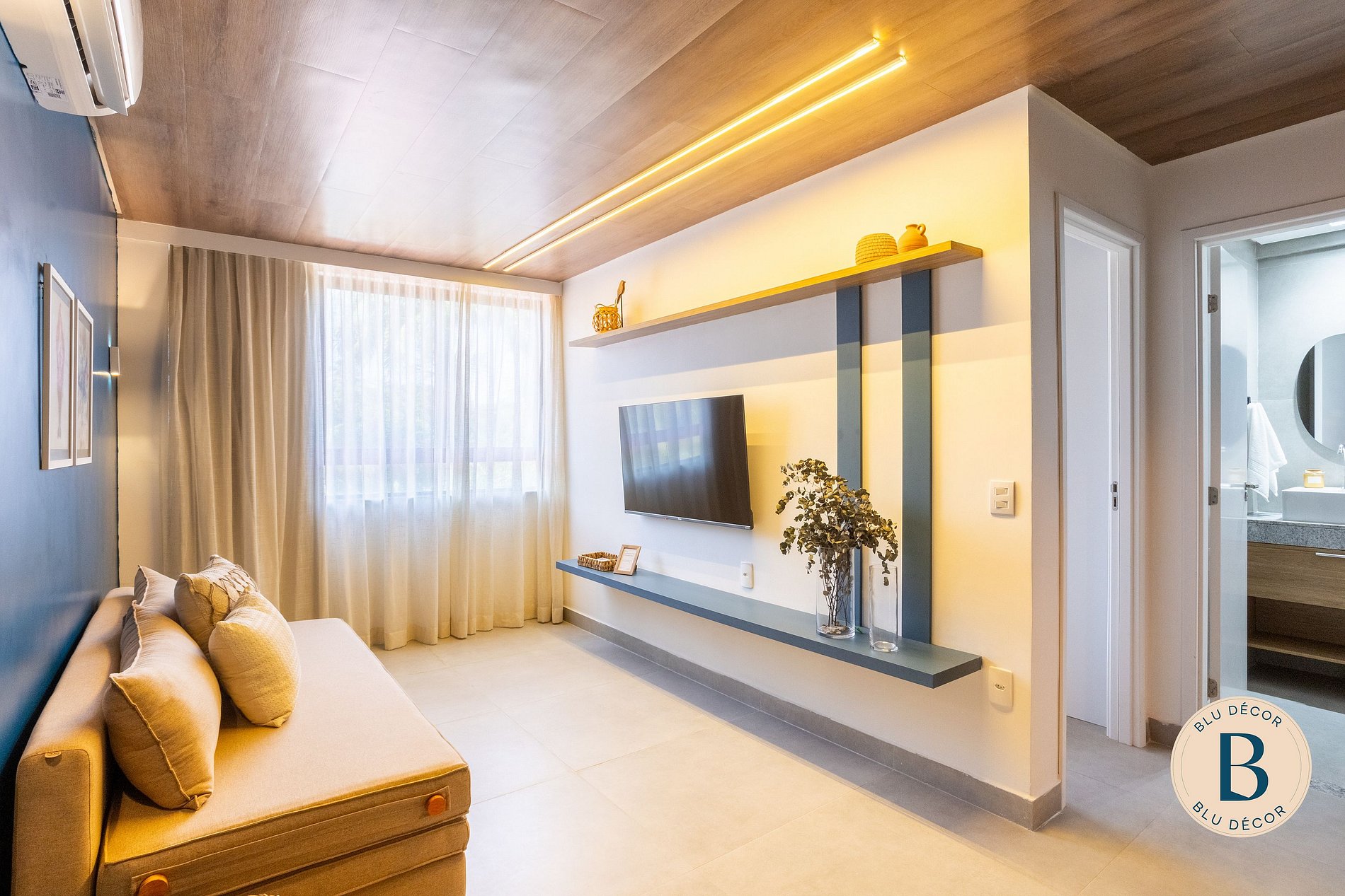 A sala é integrada, com TV, ar-condicionado e espaço para relaxar depois da praia. Bem-vindo ao seu lar em Porto de Galinhas! #ficaBLU
