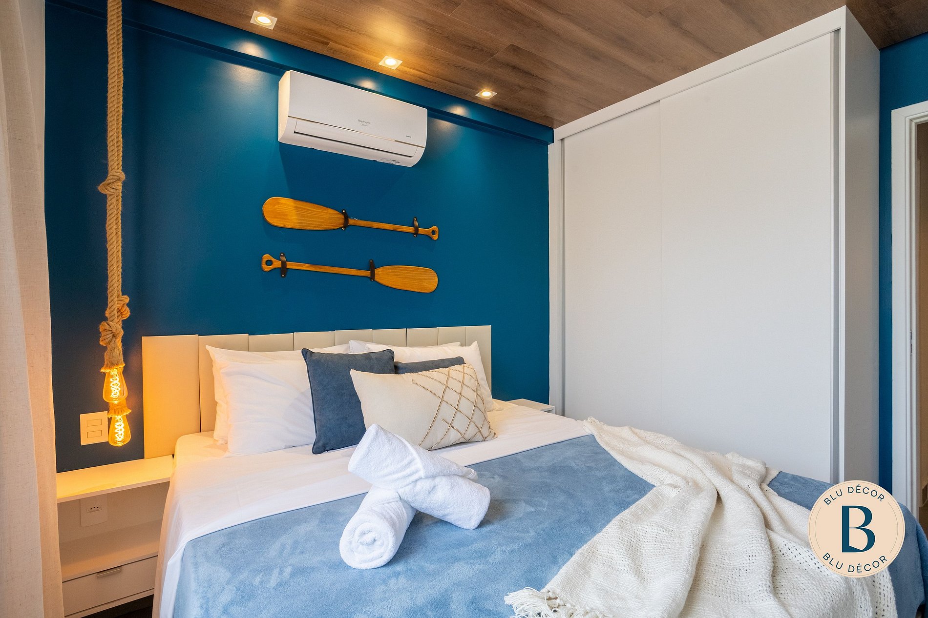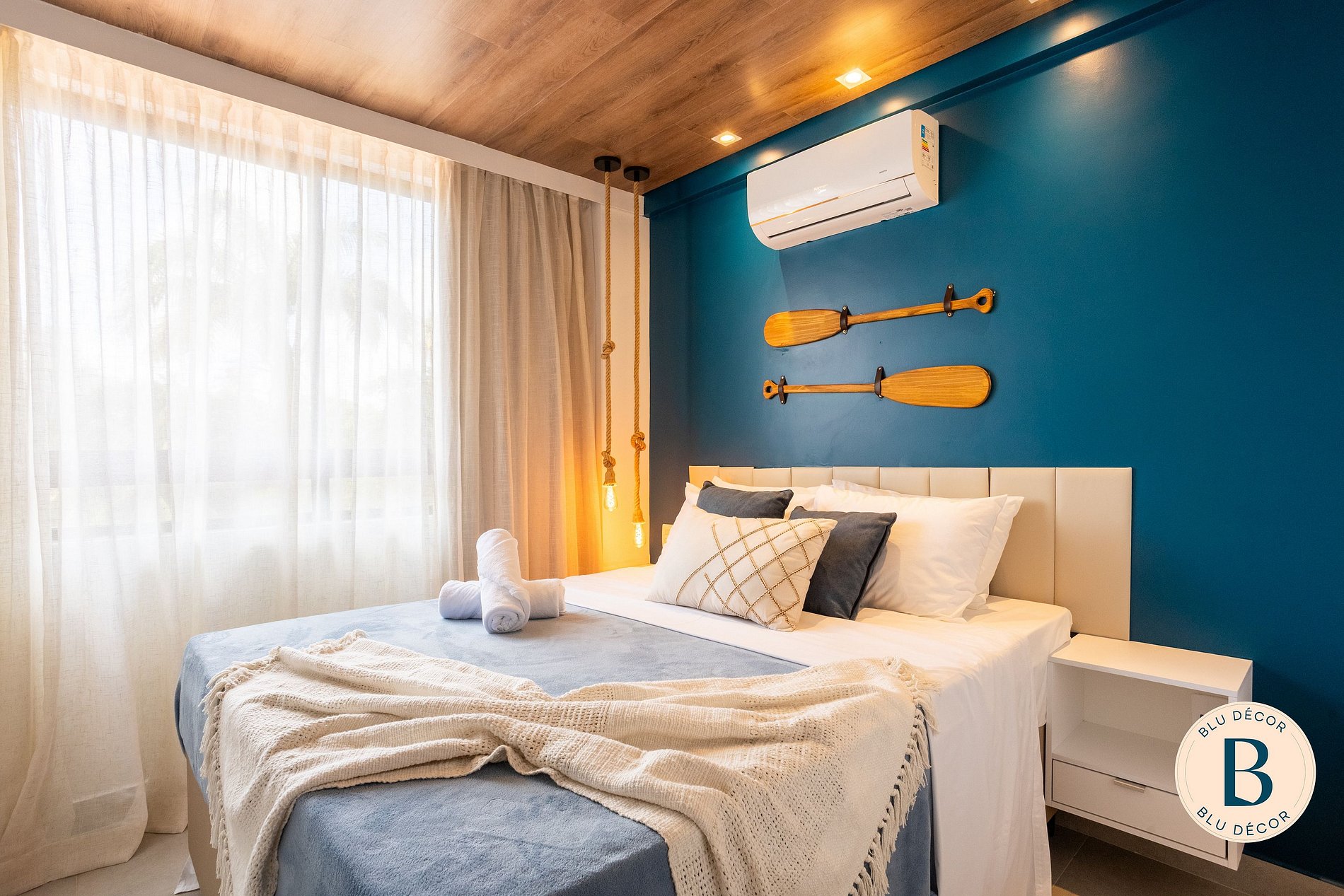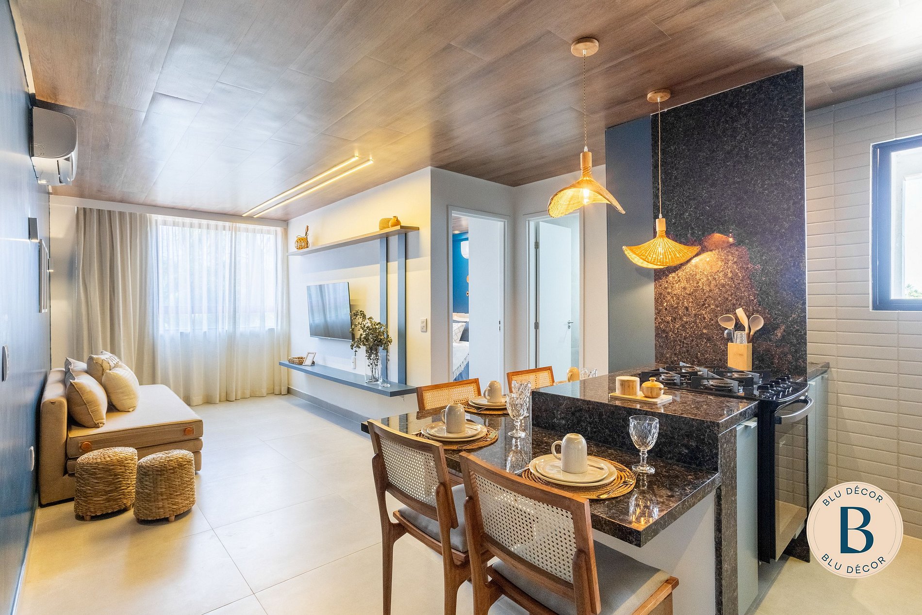A sala é integrada, com TV, ar-condicionado e espaço para relaxar depois da praia. Bem-vindo ao seu lar em Porto de Galinhas! #ficaBLU