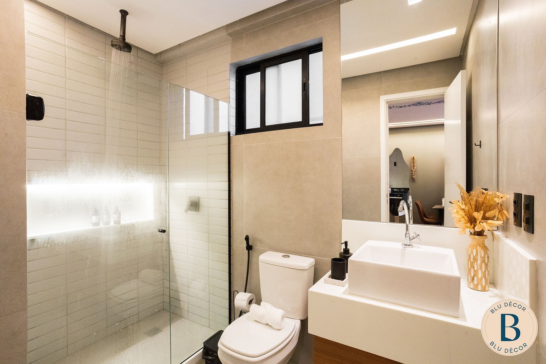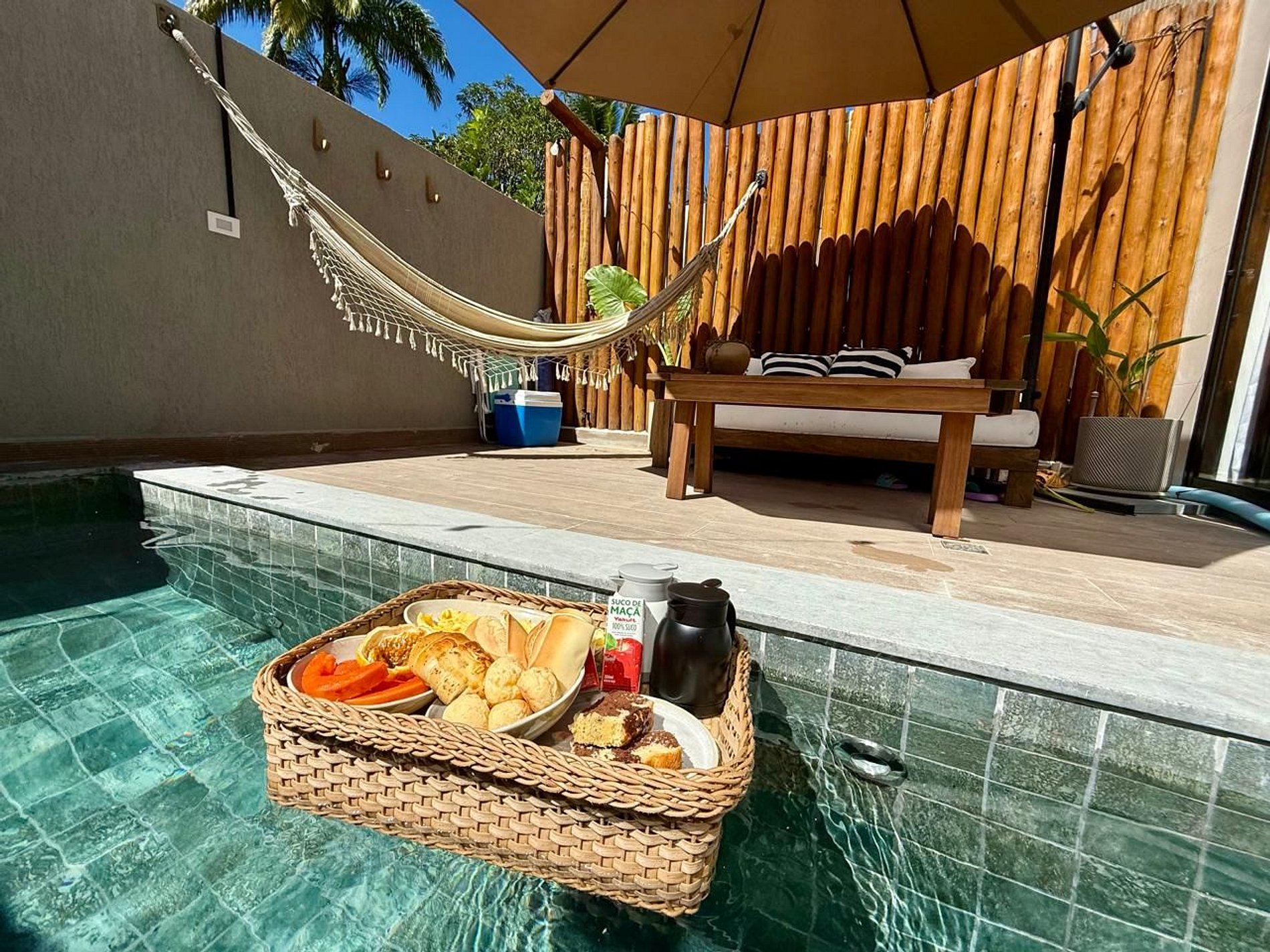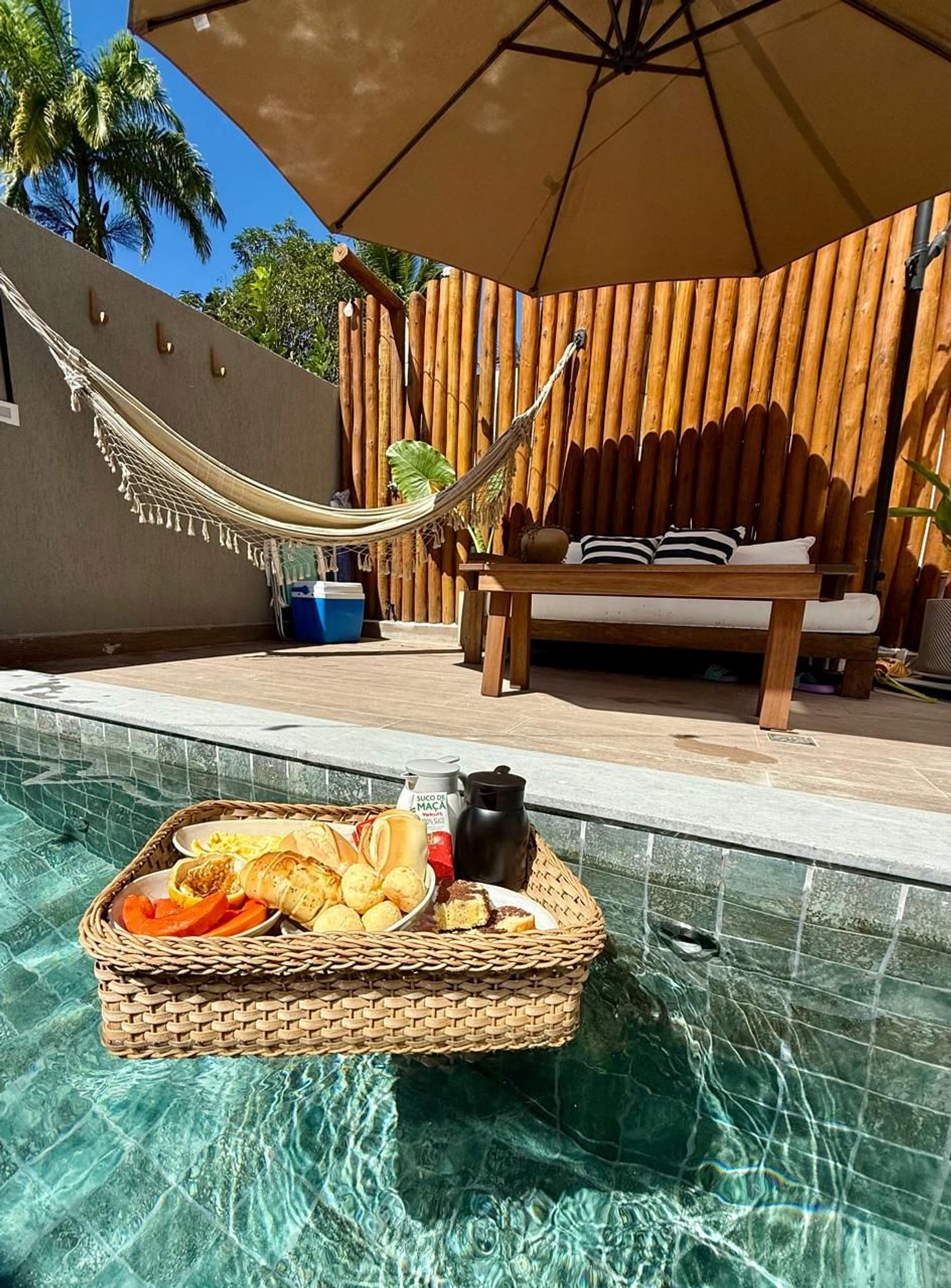 O banheiro foi pensado em cada detalhe, é uma experiência à parte. Ambiente extremamente confortável para seus momentos de cuidado pessoal. Equipado com ducha de alto padrão e aquecimento por boiller a gás, nichos em nanoglass com cromoterapia, secador de cabelo, ferro de de passar amenities personalizados (shampoo, condicionador e sabonete líquido). O grande diferencial é a sua área de lazer privativa externa: uma deliciosa piscina exclusiva para seus momentos de relaxamento e diversão. Dispõe de um ombrelone que garante sombra e conforto nos dias ensolarados, sofá, mesa e chuveirão externo e parrilha. É o cenário perfeito para criar memórias inesquecíveis. 02 cadeiras de praia, guarda-sol e cooler que você pode usar também no seu passeio com a família.