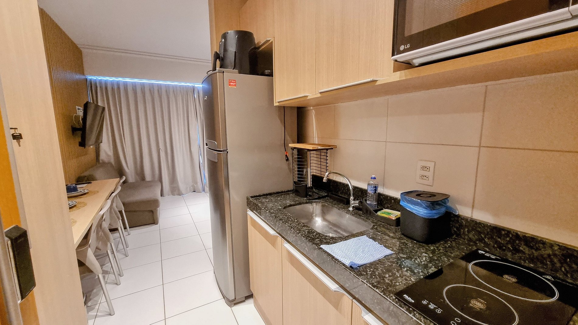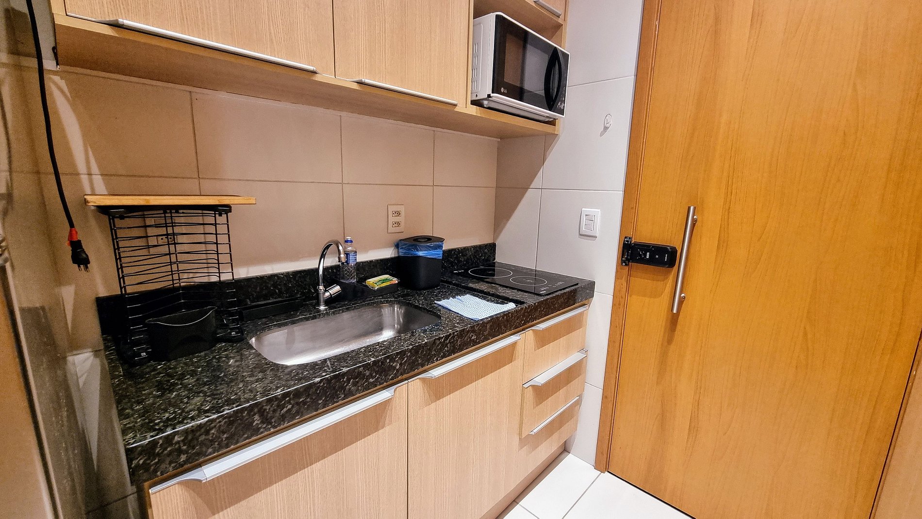 Cozinha completa, equipada com geladeira, cooktop, micro-ondas, utensílios e eletros essenciais