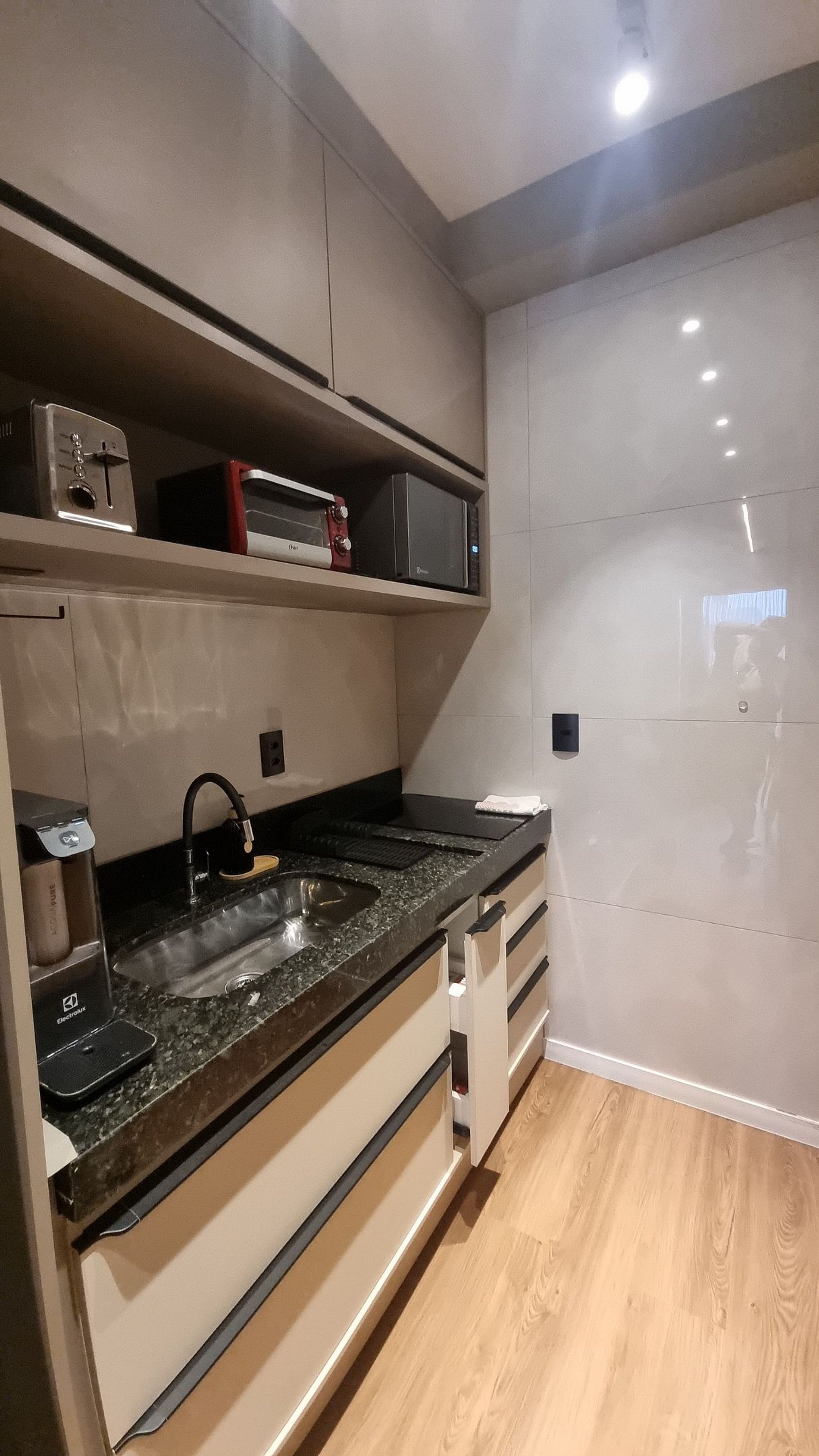 Cozinha completa, equipada com geladeira, cooktop, micro-ondas, utensílios e eletros essenciais
