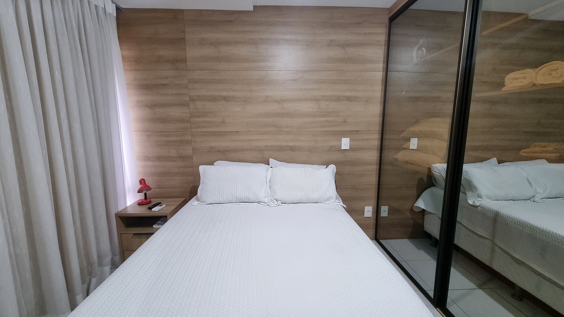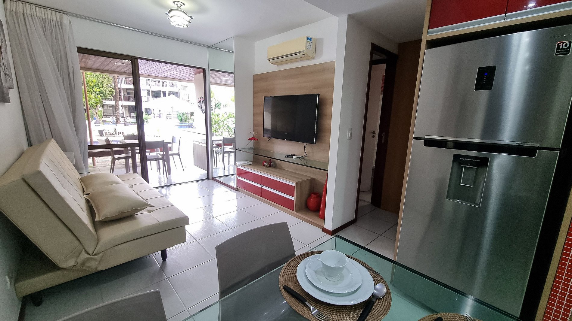 Com 2 quartos completos, ambos com ar-condicionado, armários e enxoval de qualidade; Sala de estar ampla e arejada, com sofá confortável, TV e acesso direto à varanda; Varanda mobiliada com vista para as piscinas, ideal para relaxar no fim da tarde;