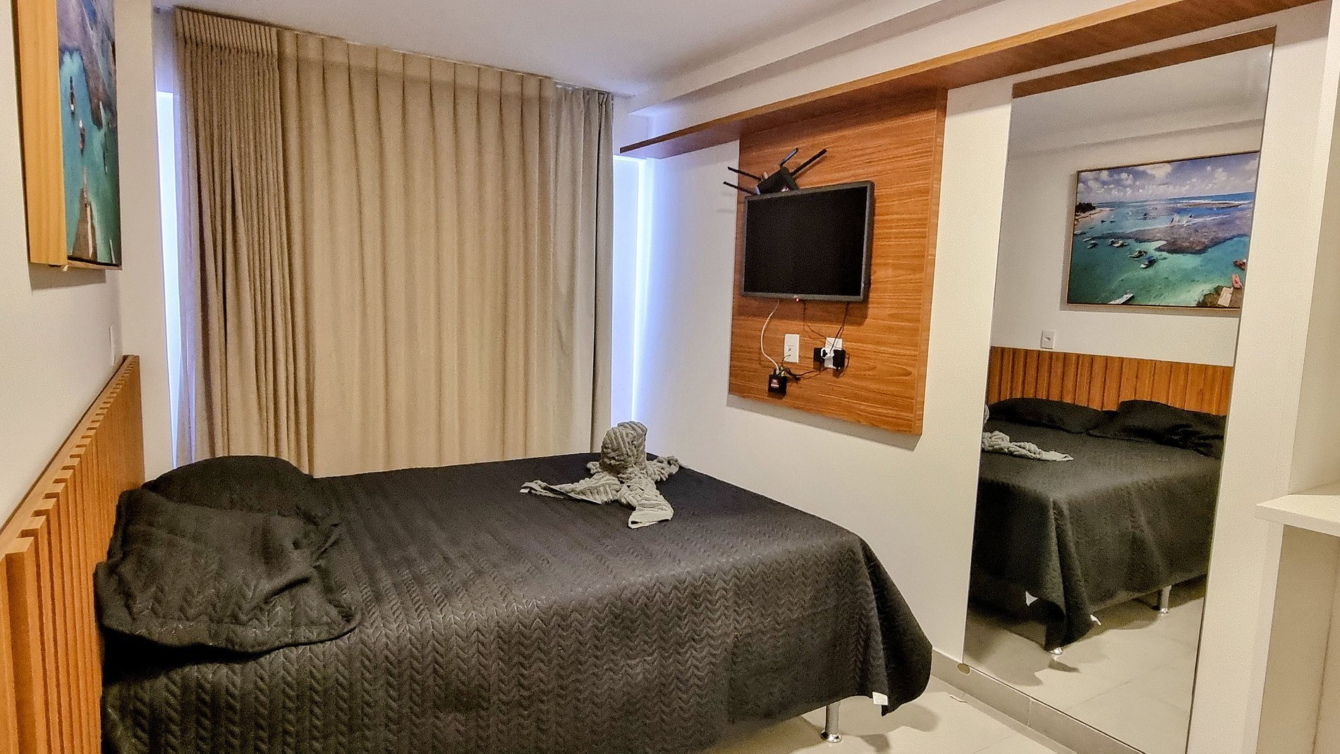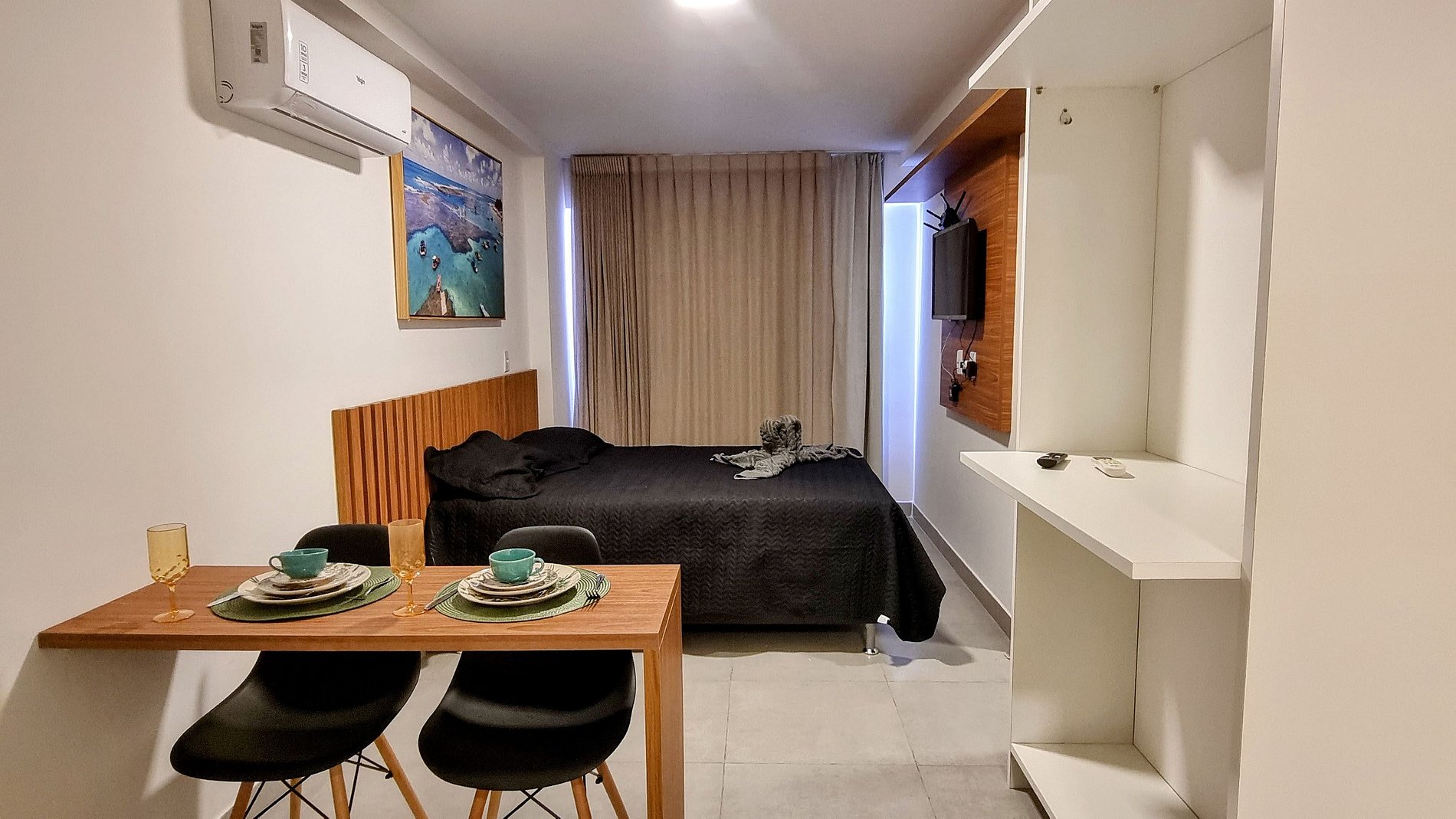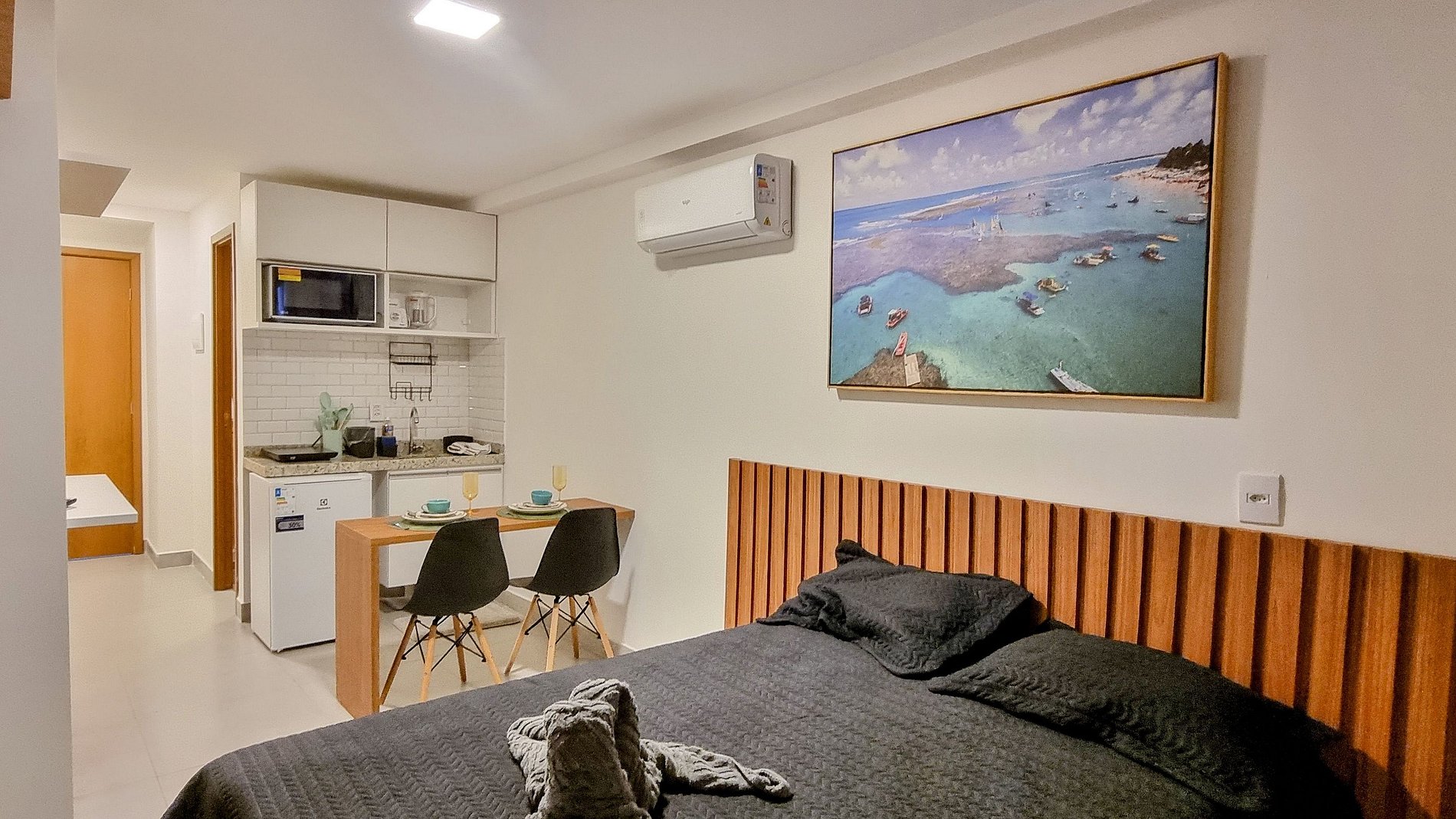 Apartamentos modernos, com ar-condicionado, Wi-Fi e fechadura eletrônica.