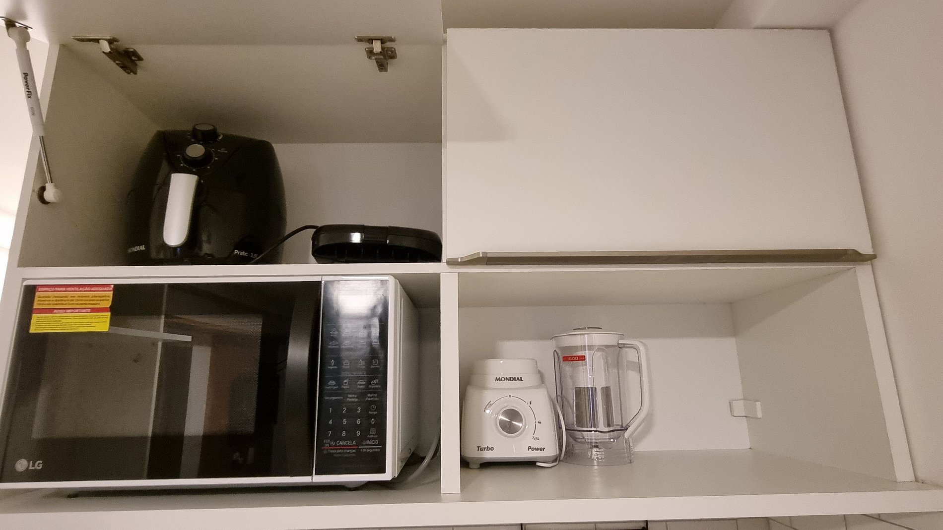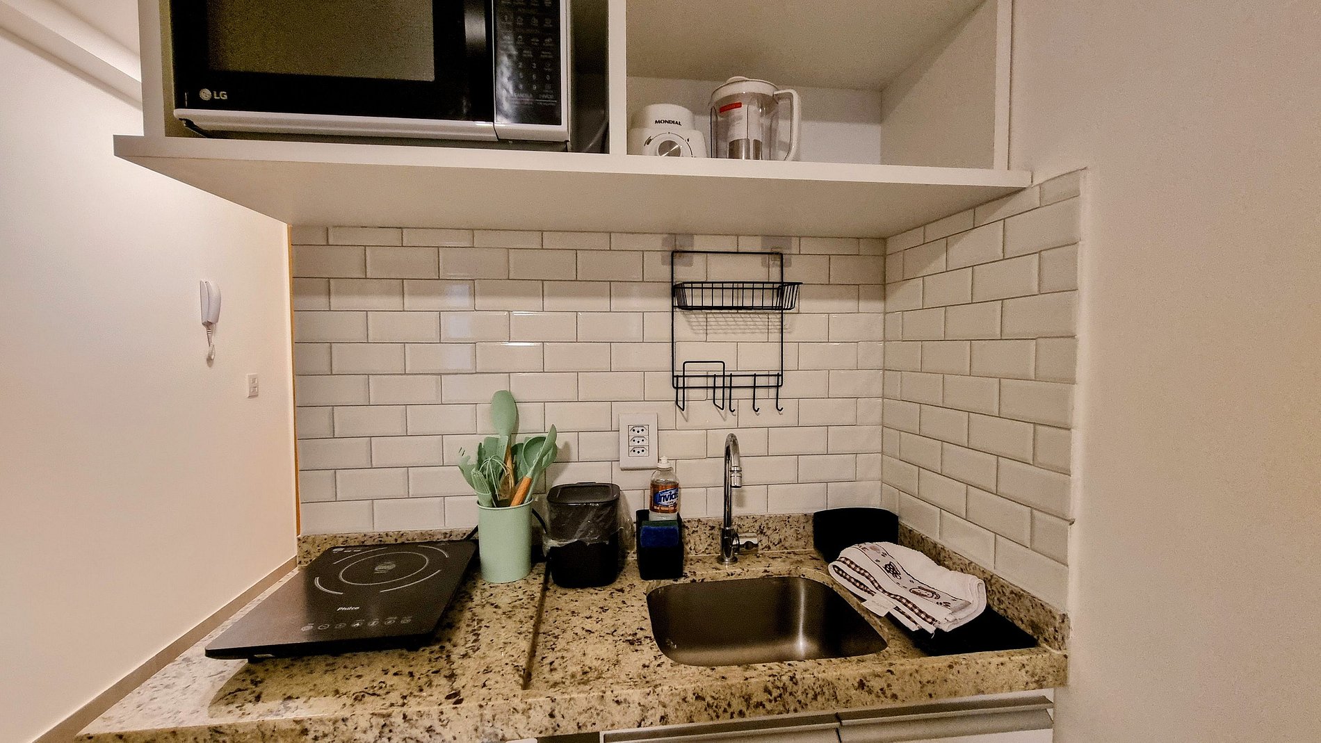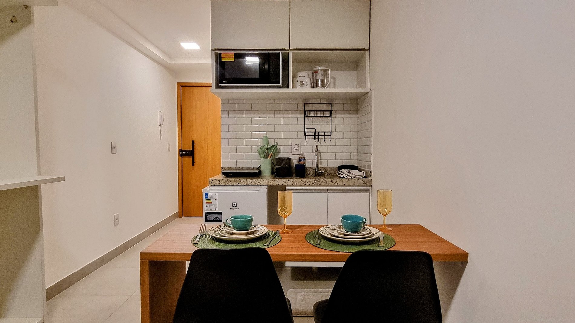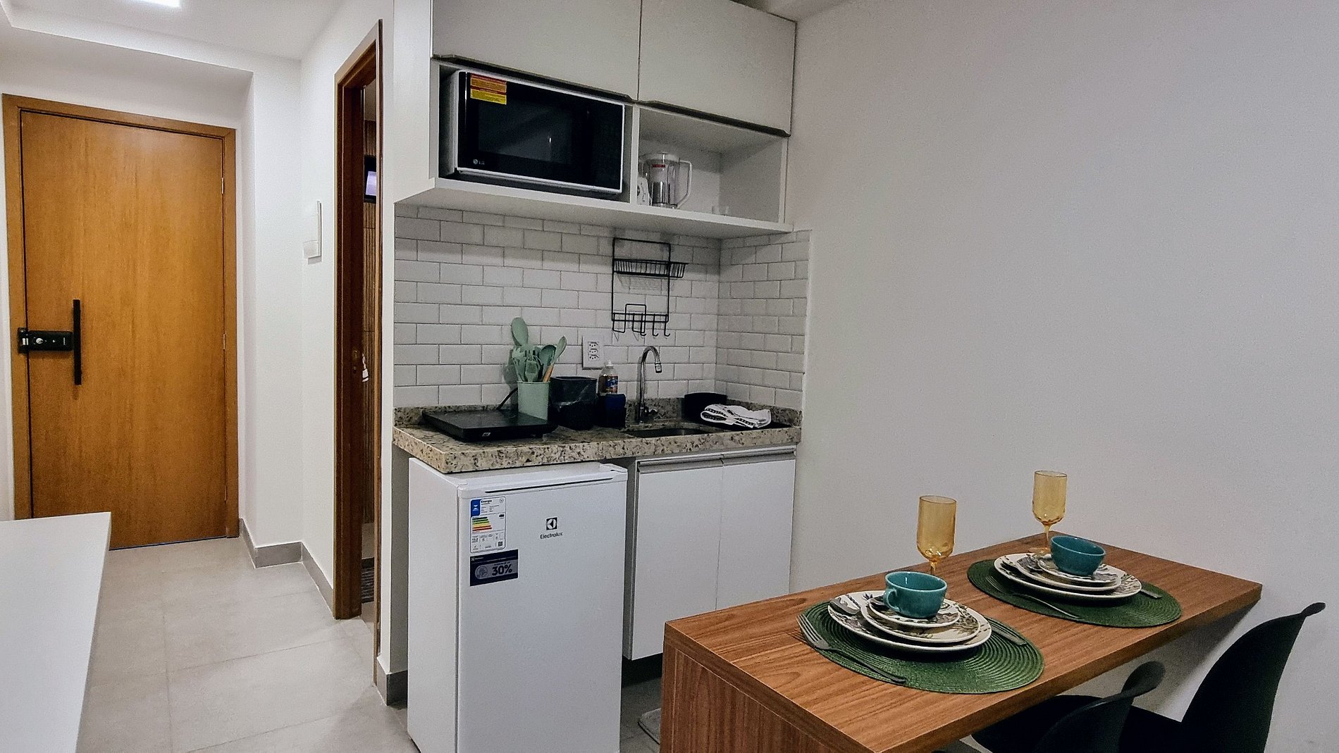 Cozinha equipada com frigobar, cooktop, micro-ondas, utensílios e bancada para refeições.