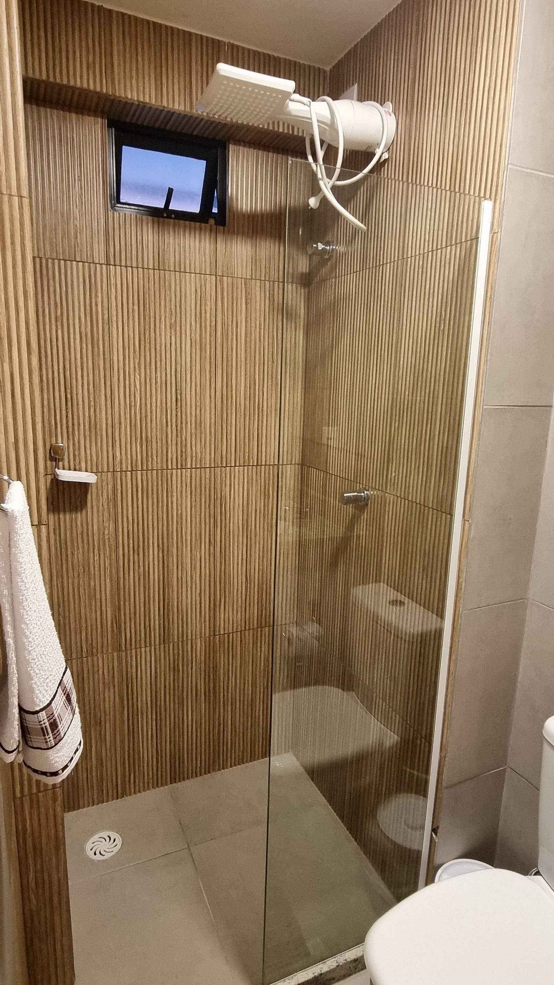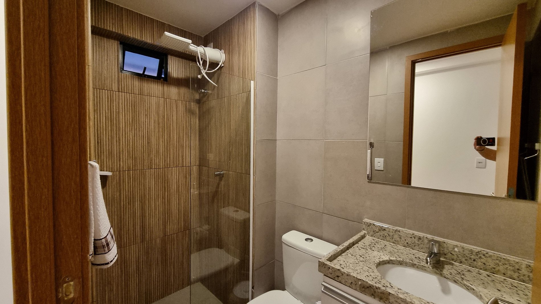 Banheiro moderno com chuveiro quente e acabamento de alto padrão.
